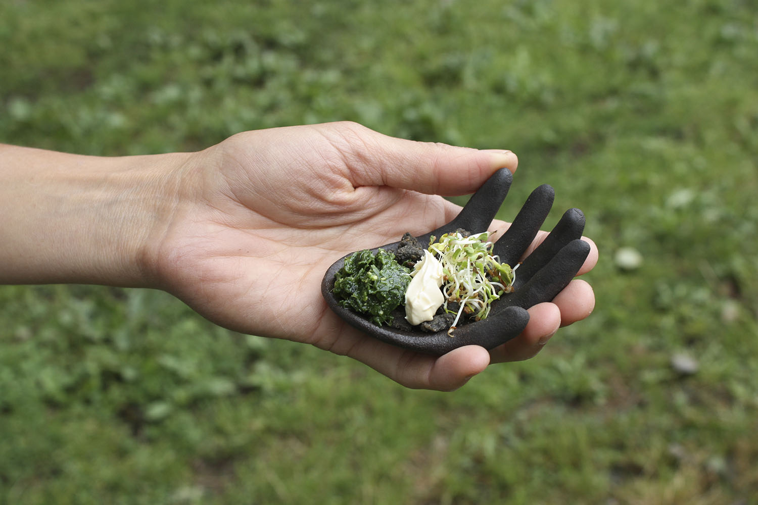 En collaboration avec Carolina Fonseca, Main en céramique, crumble de lentille, graines germées, crème fraiche, pesto de fane de légumes, parc de la Maison Garenne, Saint-Sauves d’Auvergne | 2022